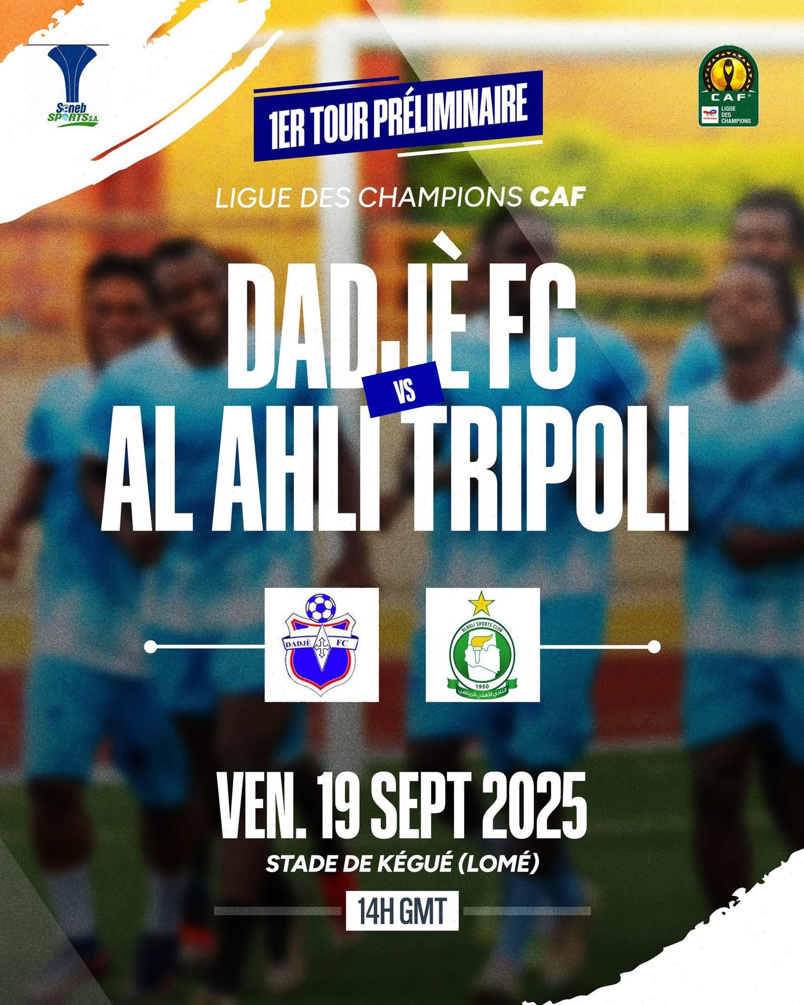 C’est le jour J, Dadjè FC débute sa campagne africaine ce vendredi 19 septembre 2025. Le représentant béninois Dadjè FC fait son entrée en Ligue des champions de la CAF face au club libyen, Al Ahli Tripoli. La rencontre est prévue au stade de Kégué à Lomé, au Togo, pour le match aller du 1er tour préliminaire. Le coup d’envoi est prévu à 14h00, heure locale (15h à Cotonou). La rencontre sera dirigée par le Libérien Washington Dolo, assisté de ses compatriotes Joël Wonka Doe et Moses Johnson. Le quatrième officiel, Mahmoud Alie Conteh, est originaire de Sierra Leone. La supervision sera assurée par l’Ivoirien Eugène Marie Diomandé, désigné commissaire du match par la CAF.