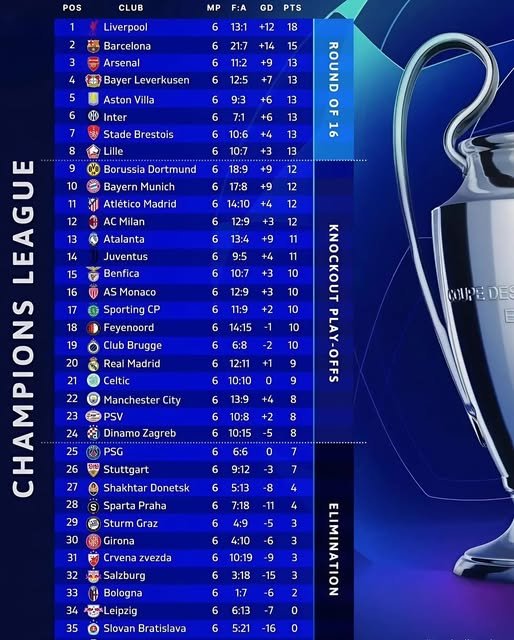 La première phase de la Ligue des Champions 2024-2025 a s’est poursuivi avec des rencontres palpitantes lors de la 6e journée, qui s’est tenue les 11 et 12 décembre 2024. Entre confirmations et surprises, voici un récapitulatif complet des résultats et des classements.