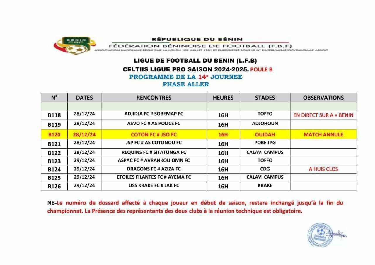 Le suspense autour su derby entre Coton FC et la Jeunesse Sportive de Ouidah FC (JSO), initialement annoncé comme annulé, a finalement été levé. Ce match de la 14e journée de la Celtiis Ligue Pro aura donc lieu. Après une réunion du Comité Exécutif de la Fédération Béninoise de Football (FBF) tenue ce vendredi 27 décembre 2024, la tenue du match a été confirmée. Le choc aura lieu ce samedi 28 décembre 2024 et sera diffusé en direct sur A+ BÉNIN.