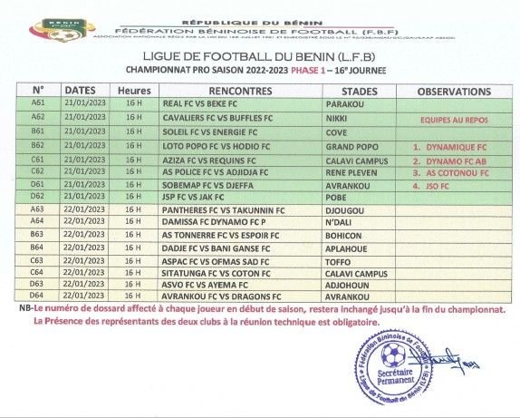 Ligue Pro Bénin 2022-23 : Le programme officiel de la 16ème journée