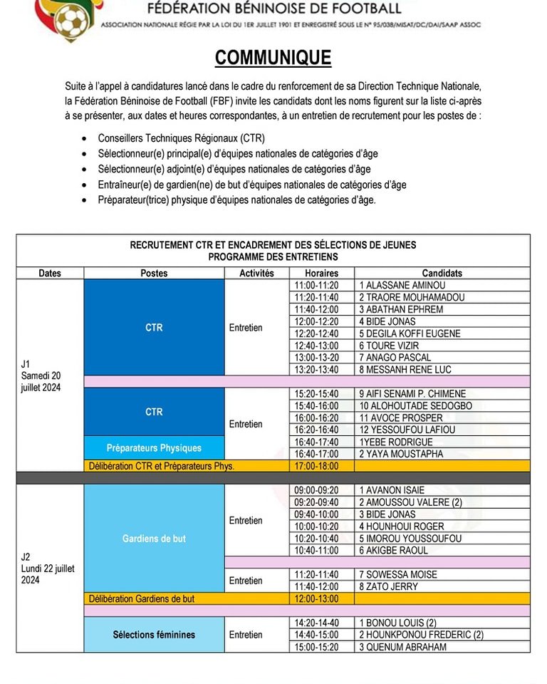 Dans un communiqué publié le mercredi 17 juillet 2024, la FBF a listé les candidats sélectionnés pour un entretien de recrutement. Les entretiens auront lieu au siège de la FBF à Porto-Novo, suivant les dates et heures précises retenues pour chaque poste.
