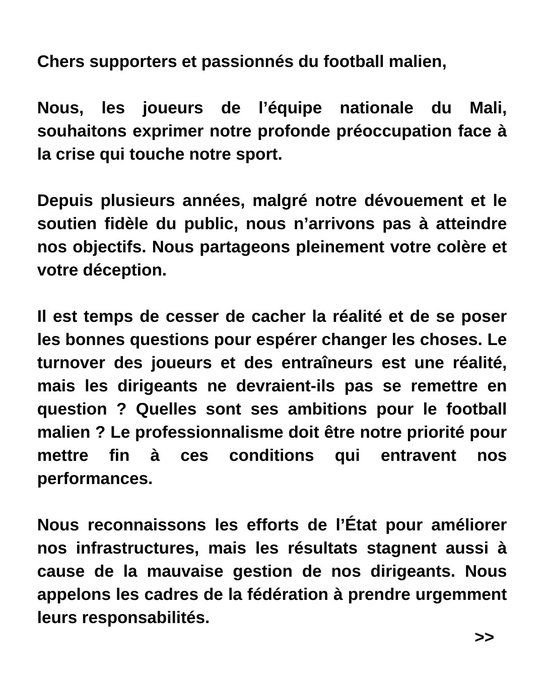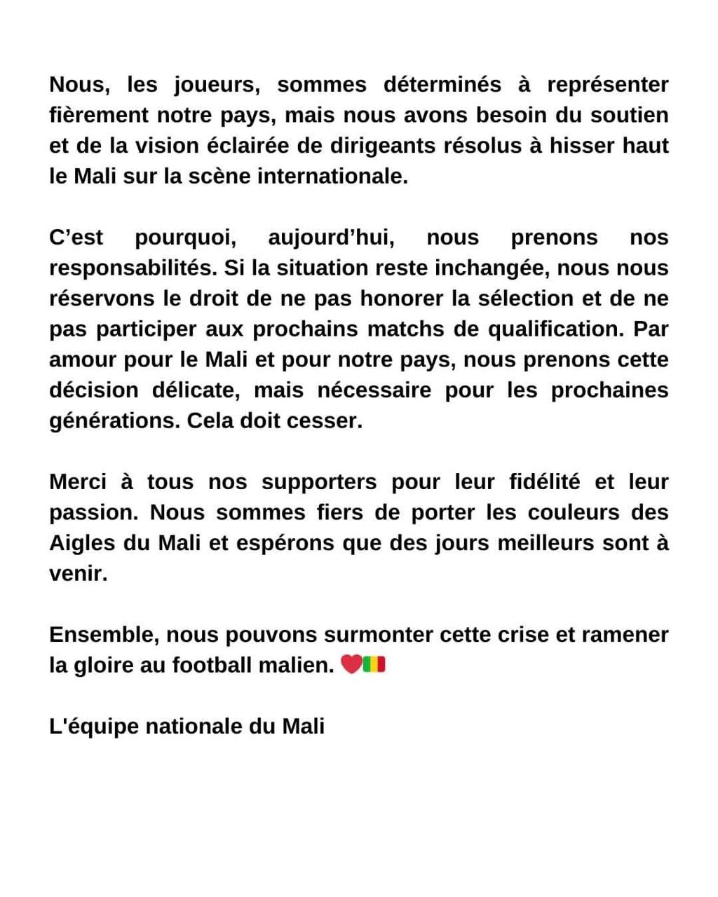 “Nous reconnaissons les efforts de l’État pour améliorer nos infrastructures, mais les résultats stagnent aussi à cause de la mauvaise gestion de nos dirigeants. Nous appelons les cadres de la fédération à prendre urgemment leurs responsabilités. Nous, les joueurs, sommes déterminés à représenter fièrement notre pays, mais nous avons besoin du soutien et de la vision éclairée de dirigeants résolus à hisser haut le Mali sur la scène internationale. C’est pourquoi, aujourd’hui, nous prenons nos responsabilités. Si la situation reste inchangée, nous nous réservons le droit de ne pas honorer la sélection et de ne pas participer aux prochains matchs de qualification. Par amour pour le Mali et pour notre pays, nous prenons cette décision délicate, mais nécessaire pour les prochaines générations. Cela doit cesser”, peut-on lire.