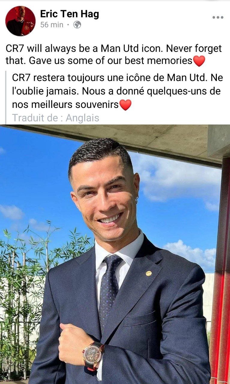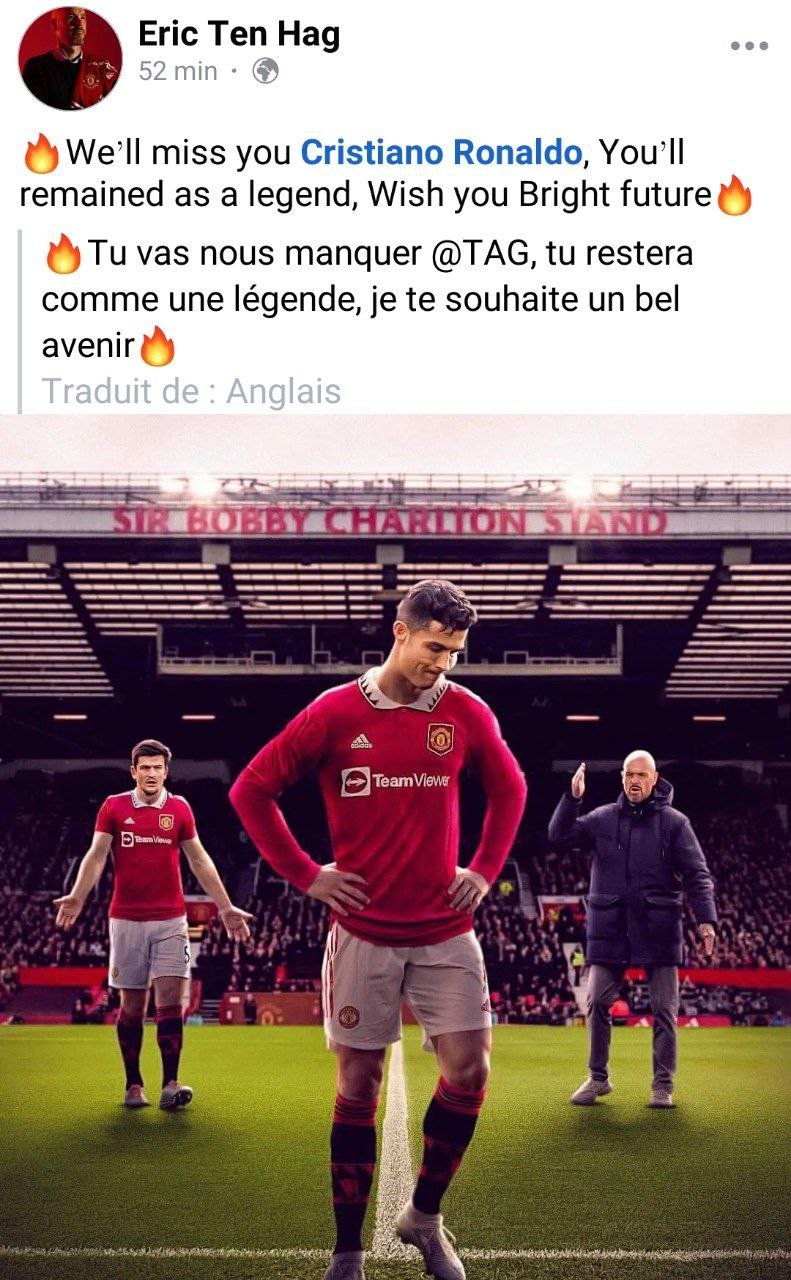 « 🔥Tu vas nous manquer Cristiano Ronaldo, tu resteras comme une légende, je te souhaite un avenir radieux.🔥 CR7 sera toujours une icône de Man Utd. N’oublie jamais ça. Nous a donné certains de nos meilleurs souvenirs❤️ »