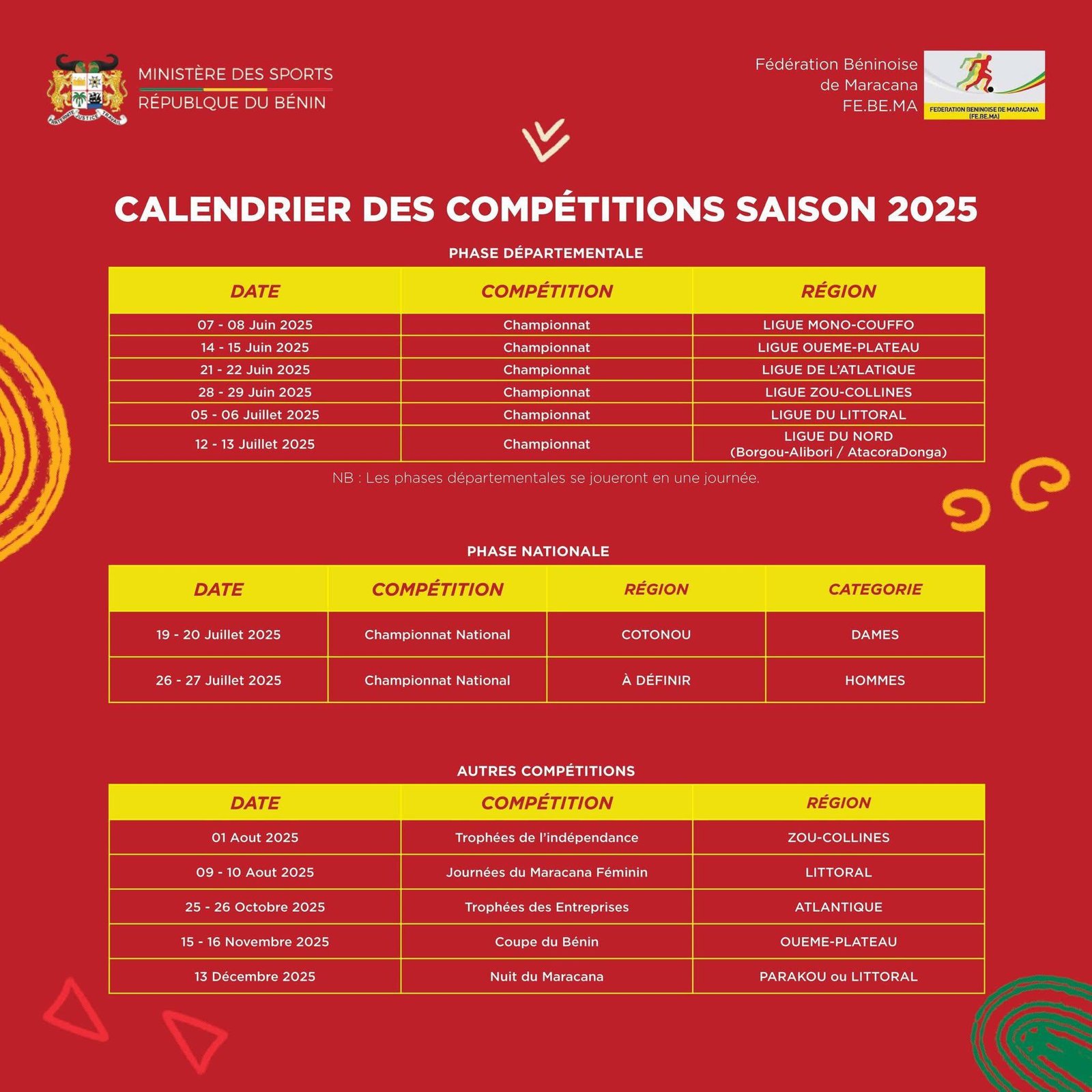 Le Maracana béninois s’apprête à vivre une année 2025 exceptionnelle ! La Fédération Béninoise de Maracana (FE.BE.MA) a dévoilé son calendrier officiel, annonçant une saison intense, bien structurée et marquée par des rendez-vous sportifs majeurs à travers tout le pays. De la base jusqu’aux sommets, cette discipline en plein essor continue de fédérer, de mobiliser et de séduire de plus en plus de passionnés.