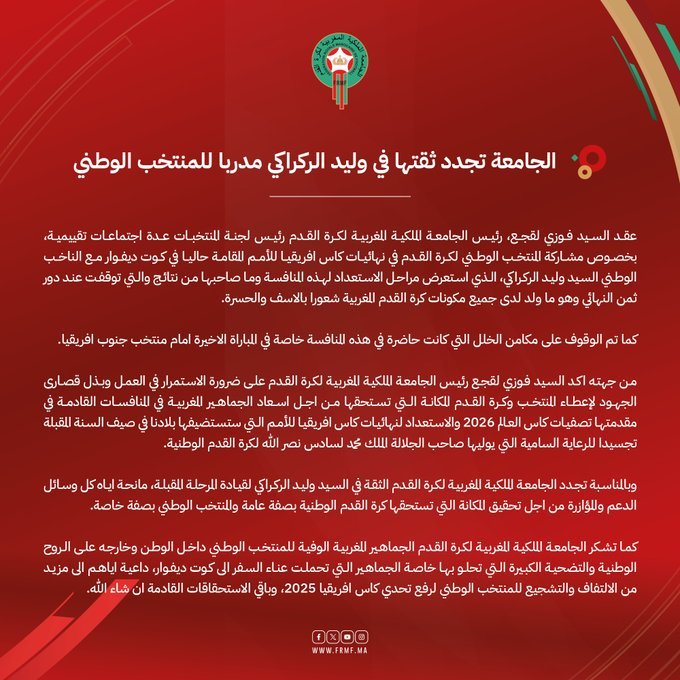 Dans un communiqué officiel publié ce lundi 05 février 2024, la FRMF a confirmé son soutien continu à Walid Regragui et son engagement à lui fournir tous les moyens nécessaires pour conduire l’équipe nationale vers le succès.