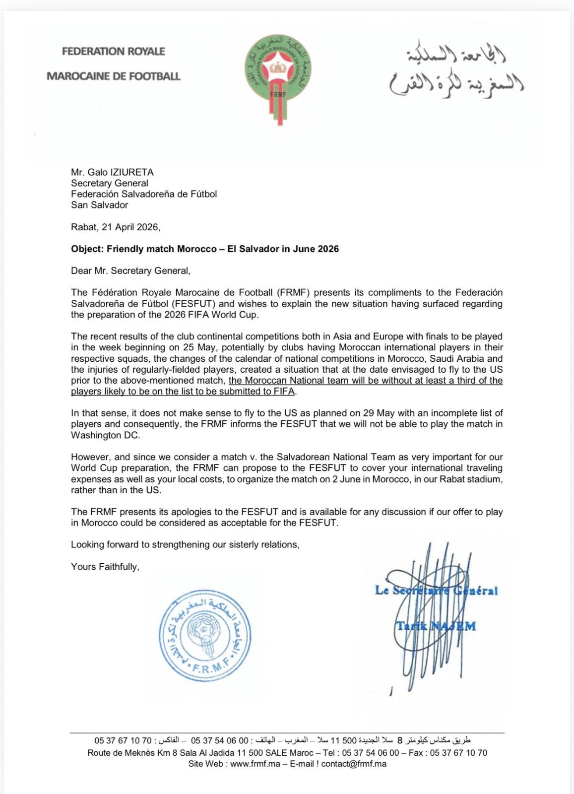 Face à cette situation, la FRMF a proposé de déplacer la rencontre au Maroc le 2 juin, en prenant en charge les frais de déplacement et de séjour de la sélection salvadorienne. Une offre rejetée par la FESFUT. Yamil Bukele invoque les règles de la FIFA, qui interdisent à une sélection de disputer des matchs sur deux continents différents durant une même fenêtre internationale. Le Salvador doit en effet affronter le Qatar le 6 juin à Los Angeles, ce qui rend le déplacement en Afrique incompatible avec son programme.