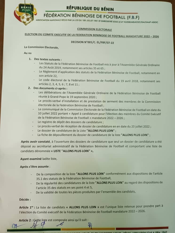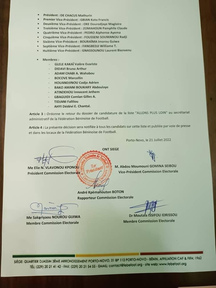 De plus en plus, tout se précise, se confirme et se dessine pour une continuité de la gestion du président Mathurin de-Chacus à la Fédération Béninoise de Football. Plus rien n’arrête le président Mathurin de-Chacus qui porte la liste « ALLONS PLUS LOIN ». En effet, Mathurin de-Chacus a maintenant le champ libre pour rempiler. Candidat à sa propre succession, il sera réélu haut les mains le 20 Août 2022. Plus de doute autour. Ce jeudi 21 juillet 2022, sa liste a été validée par la commission électorale en charge des élections présidée par Maître Élie Vlavonou. Les regards sont tournés vers l’assemblée générale élective proprement dite.