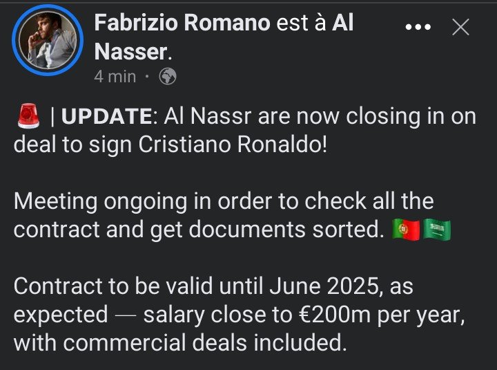D’après le très fiable (🗞️ Fabrizio Romano), Cristiano Ronaldo aurait signé son contrat avec Al-Nassr. Il devrait toucher un salaire de 200M€/an, jusqu’en juin 2025, toujours selon le journaliste italien.