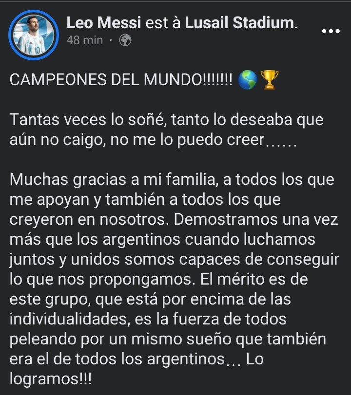 « Regardez ce trophée, il est tellement beau ! C’était le trophée que j’ai voulu toute ma vie. C’était mon rêve d’enfant. Nous avons hâte d’être en Argentine pour voir à quel point les célébrations vont être folles. »