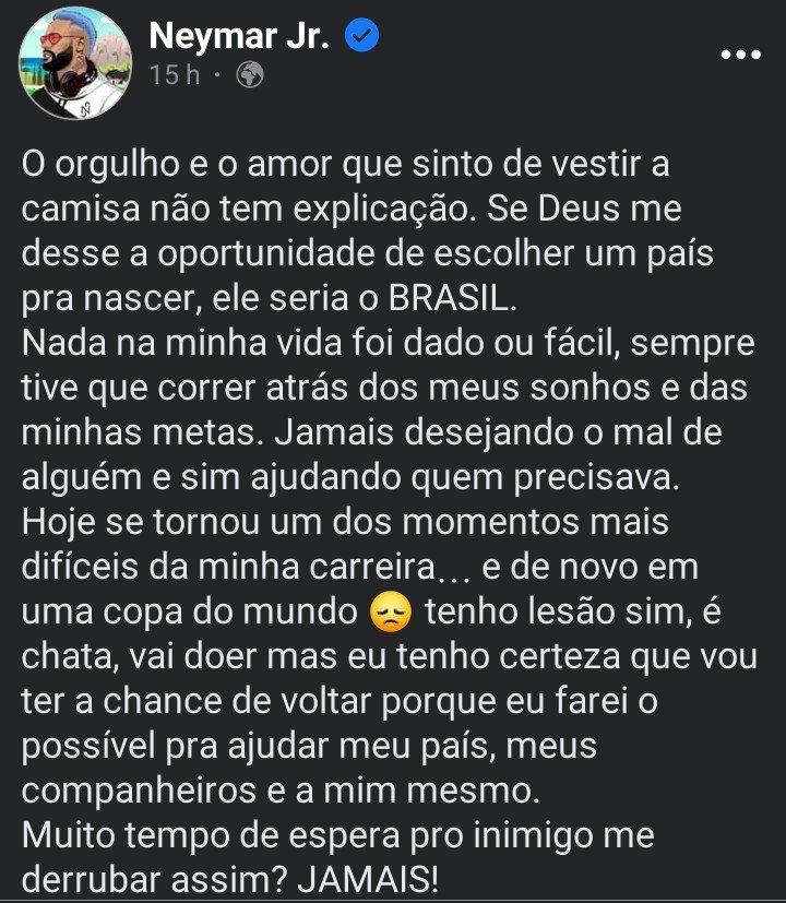 Aujourd’hui, est devenu l’un des moments les plus difficiles de ma carrière… Et encore en coupe du monde 😞 J’ai une blessure oui, c’est embêtant, ça va faire mal mais je suis sûr que j’aurai une chance de revenir parce que j’ai Je ferai de mon mieux pour aider mon pays, mes compagnons et moi-même.