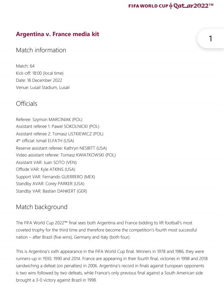 La finale de la Coupe du Monde de la FIFA 2022™ verra l’Argentine et la France tenter de remporter pour la troisième fois le trophée le plus convoité du football et ainsi devenir la quatrième nation la plus titrée de la compétition, après le Brésil (cinq victoires), l’Allemagne et l’Italie (quatre pour les deux).