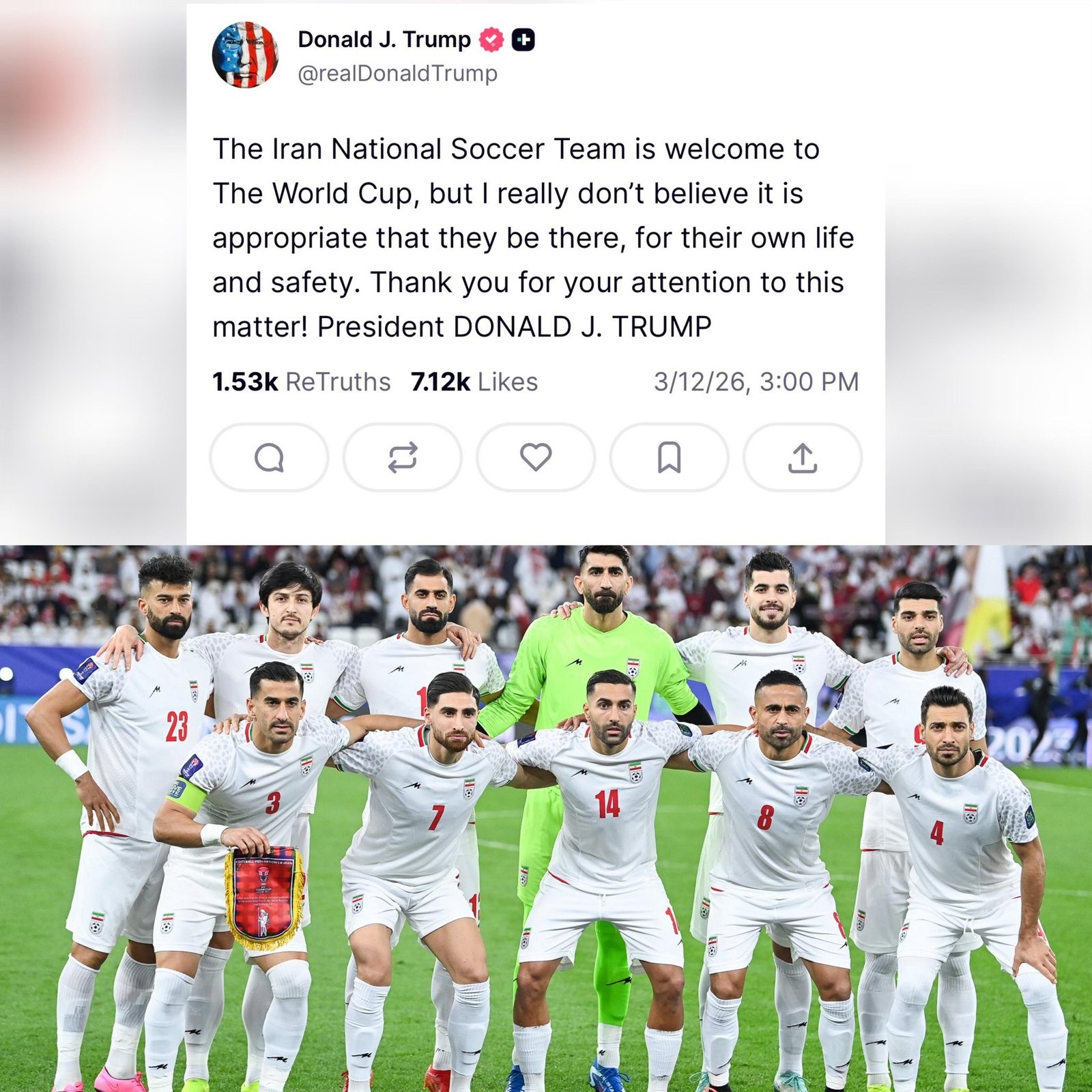 « L’équipe nationale de football d’Iran est la bienvenue à la Coupe du monde, mais je ne pense vraiment pas qu’il soit approprié qu’ils s’y rendent, pour leur propre vie et leur sécurité », a écrit Donald Trump. « Merci de votre attention sur ce point », a-t-il ajouté.