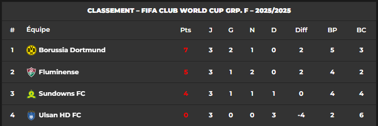 Les Sud-Africains des Mamelodi Sundowns ont marqué les esprits lors de cette Coupe du monde des clubs. Après une victoire inaugurale 1-0 face aux Sud-Coréens d’Ulsan HD et une défaite spectaculaire contre le Borussia Dortmund (4-3), ils espéraient encore se qualifier pour les huitièmes de finale. Mais malgré leur solide prestation et un match nul 0-0 face à Fluminense, les Sundowns doivent quitter la compétition dès la phase de groupes. Avec quatre points au compteur, ils échouent à la troisième place du groupe F, derrière Fluminense et Dortmund, et voient leur beau parcours s’arrêter là.