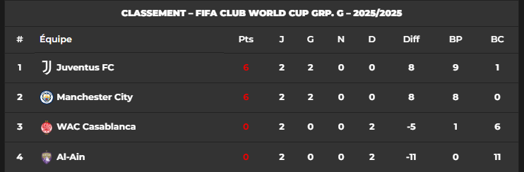 Le Wydad Casablanca, représentant marocain dans le groupe G, a été lourdement battu par la Juventus (4-1) lors de la 2e journée, après une défaite initiale contre Manchester City (2-0). Avec deux défaites en deux matchs, les Rouges et Blancs sont éliminés. Ils affronteront Al Ain jeudi pour tenter de sauver l’honneur.