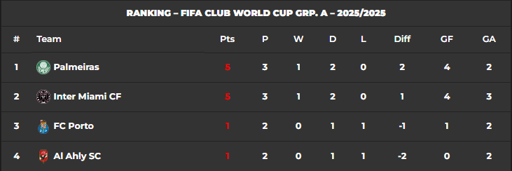 Dans le groupe A, Al Ahly du Caire a été tenu en échec par le FC Porto dans un match spectaculaire (4-4), disputé dans la nuit du lundi 23 au mardi 24 juin 2025. Les Égyptiens devaient s’imposer largement et espérer une victoire de l’Inter Miami face à Palmeiras, mais ce match s’est soldé par un nul (2-2). Al Ahly termine donc dernier du groupe et quitte le tournoi.