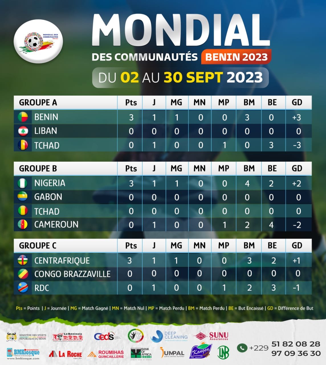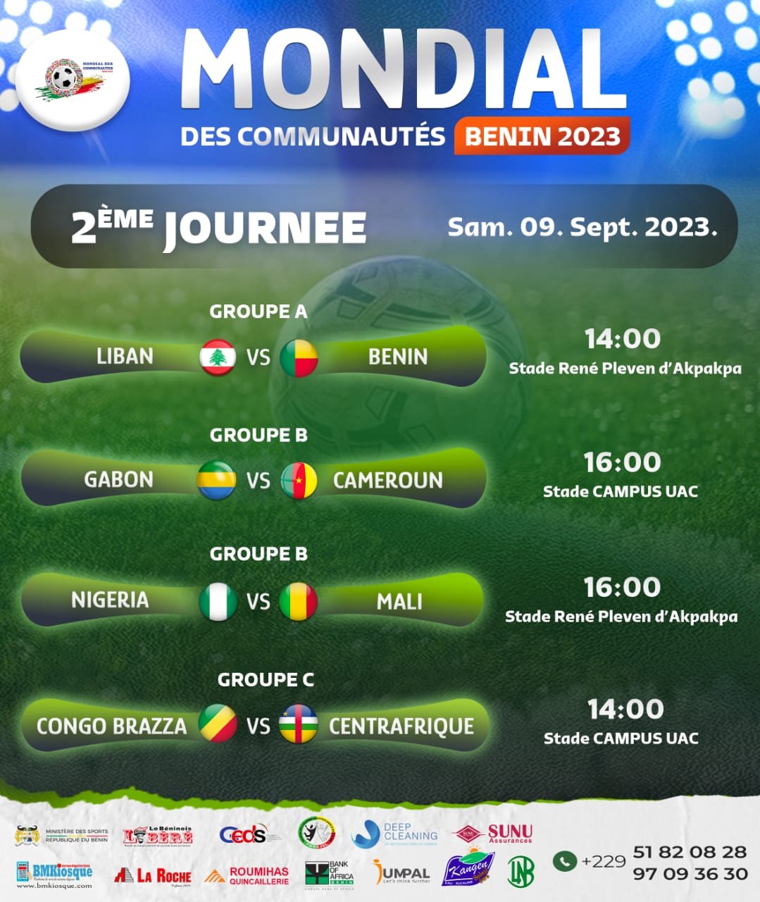 Ce samedi 09 septembre 2023, la deuxième journée du Mondial des Communautés 2023 au Bénin sera à l’honneur. Elle promet d’être tout aussi passionnante que la première, avec une série de matchs captivants au programme. Voici le programme de cette journée riche en émotions.