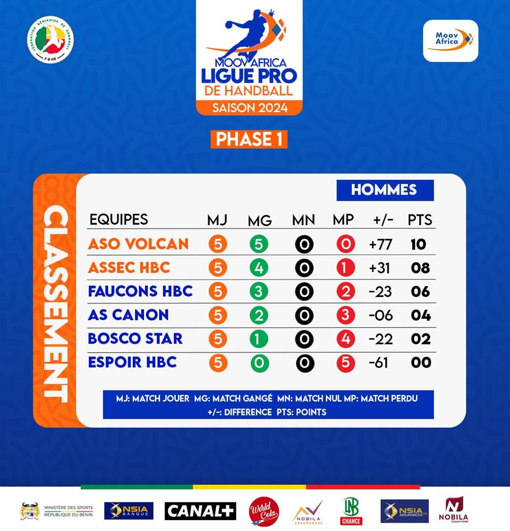 ASO Volcan, emmenée par Gildas Yenoukounmè, a terminé en tête du classement avec un parcours parfait de cinq victoires en cinq matches, accumulant 10 points (+77) et inscrivant 172 buts contre 95 encaissés. ASSEC a quant à elle fini avec 8 points (+31), ayant marqué 145 buts contre 114. Lors de la dernière journée, ASO Volcan a confirmé sa suprématie en battant ASSEC 34-23 (14-11), scellant ainsi sa première place.