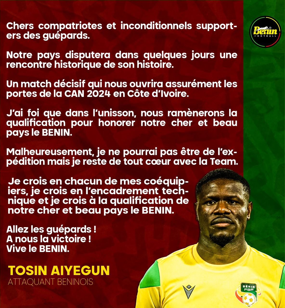 Les Guépards du Bénin font face à un revers avant leur match crucial contre le Mozambique, avec la confirmation du forfait de Tosin Aiyegun en raison d’une blessure. Le joueur a récemment réagi à son impossibilité de participer à la dernière journée des éliminatoires pour la CAN 2023.
