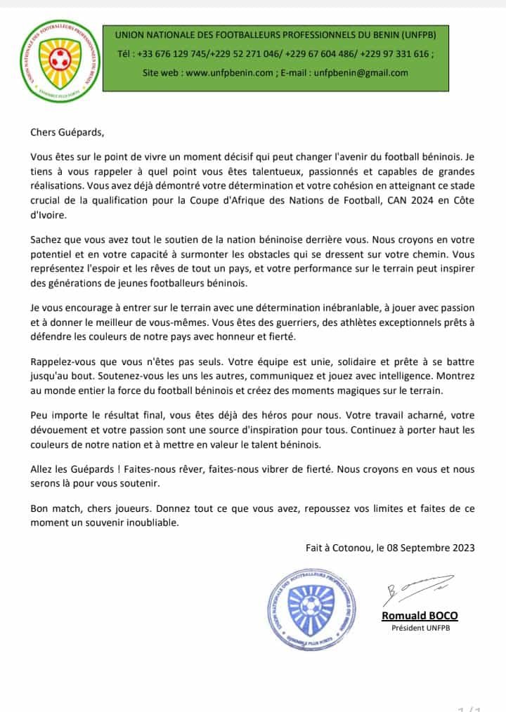 Dans un message empreint de solidarité et d’optimisme, l’Union Nationale des Footballeurs Professionnels du Bénin a exprimé tout son soutien aux Guépards. Le syndicat comprend parfaitement les enjeux de ce match et l’importance capitale de la qualification pour la CAN 2023.