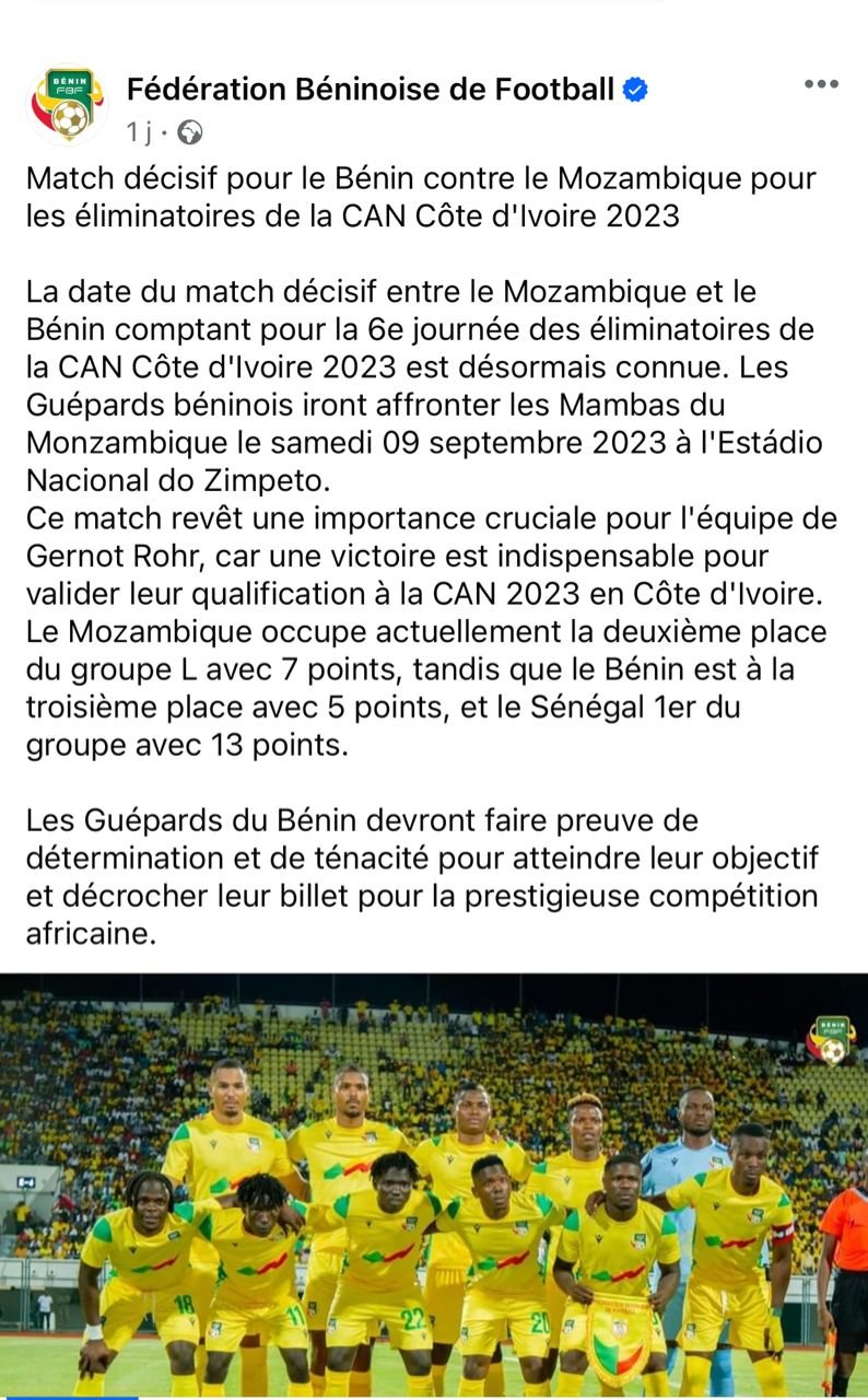 Le match très attendu entre le Mozambique et le Bénin lors de la 6ème journée des éliminatoires de la CAN Côte d’Ivoire 2023 promet un spectacle captivant. Les enjeux sont élevés pour les deux équipes qui rêvent de qualification. Le compte à rebours est lancé, et tous les regards seront tournés vers l’Estádio Nacional do Zimpeto pour ce match décisif.