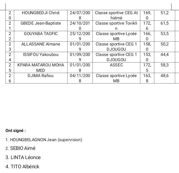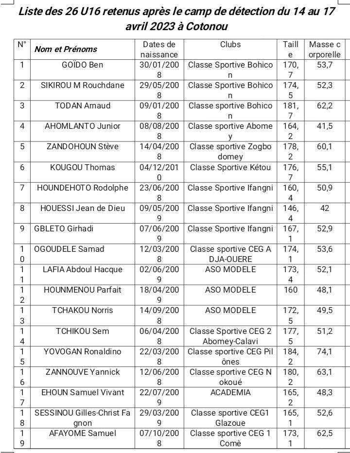 Les 26 joueurs retenus pour participer au Nantes International Handball Cup 2023 ont été classés en trois catégories en fonction de leur taille, de leur poids et de leur âge. Ils répondent tous aux critères définis par les experts et ont été choisis pour représenter dignement le Bénin lors de cette compétition internationale.