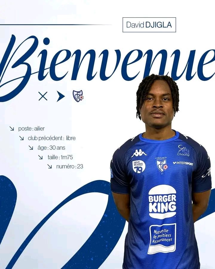 Nouveau point de chute pour David Djigla. L’ailier international béninois (28 sélections) a retrouvé un club, le FC Chauray. À 30 ans, le joueur qui a été sans club depuis plusieurs mois, vient renforcer le secteur offensif du club. Ancien des Chamois Niortais, avec lesquels il a disputé 128 rencontres en Ligue 2, David Djigla a également évolué sous les couleurs des Herbiers VF en National 2. Sans club depuis une période marquée par des blessures, l’attaquant béninois fait son retour à la compétition avec l’objectif de relancer sa carrière. Joueur expérimenté, réputé pour sa vivacité, sa percussion et sa capacité à provoquer sur son aile droite, Djigla apportera son vécu du haut niveau et son impact offensif à l’effectif chauraisien. Au FC Chauray, en quatrième division française, il retrouvera notamment un autre international béninois, Saturnin Allagbé.