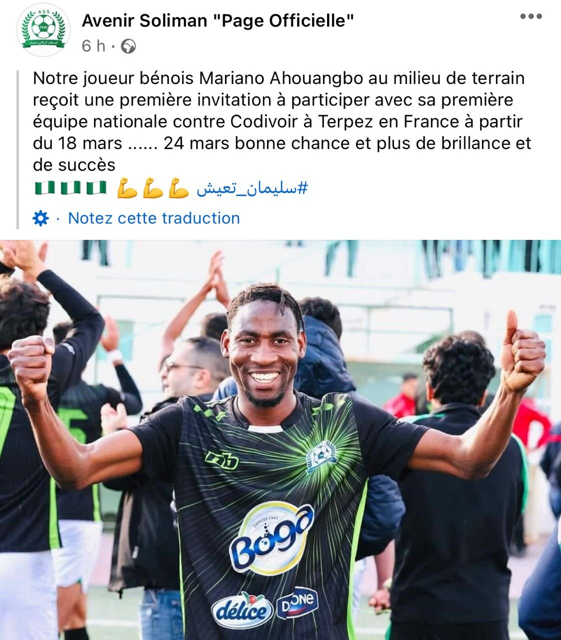 Selon cette publication, Mariano Ahouangbo a été convoqué par le sélectionneur du Bénin, Gernot Rohr, pour les Journées FIFA du mois de mars 2024. Le joueur évolue au sein du club de D1 tunisienne, reçoit ainsi sa première convocation avec l’équipe senior, après avoir représenté précédemment l’équipe U20.