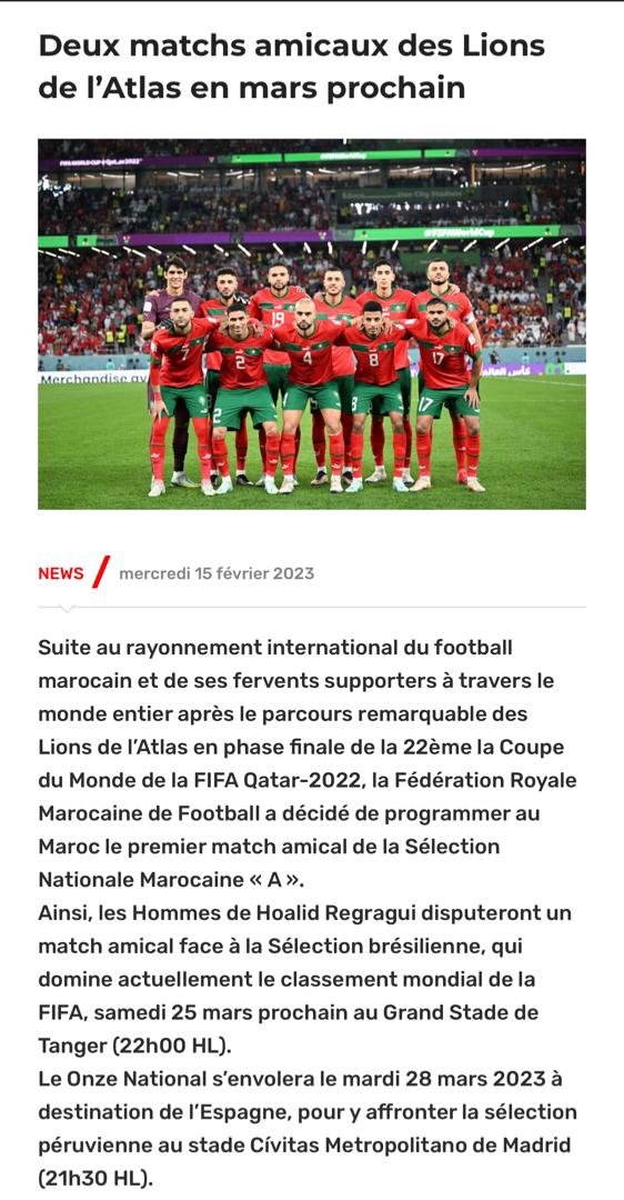 «Suite au rayonnement international du football marocain et de ses fervents supporters à travers le monde entier après le parcours remarquable des Lions de l’Atlas en phase finale de la 22ème la Coupe du Monde de la FIFA Qatar-2022, la Fédération Royale Marocaine de Football a décidé de programmer au Maroc le premier match amical de la Sélection Nationale Marocaine A», a notamment précisé la fédération dans son communiqué.