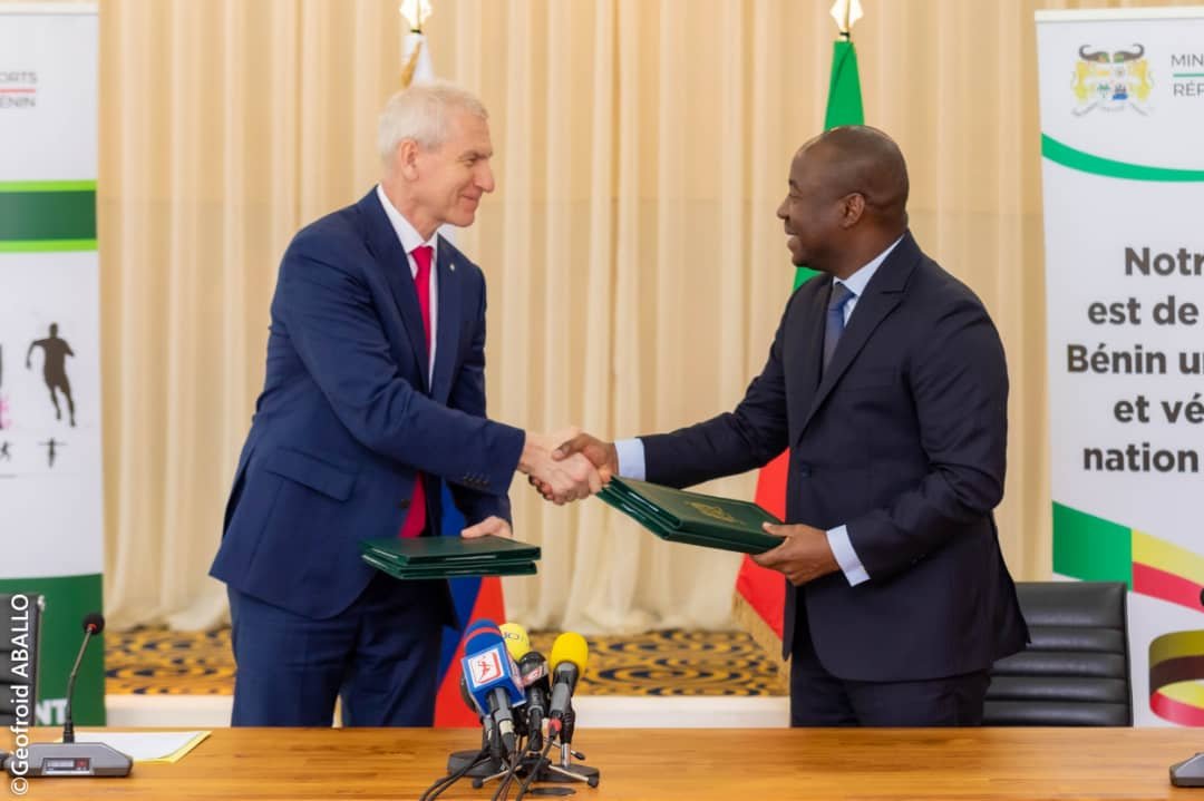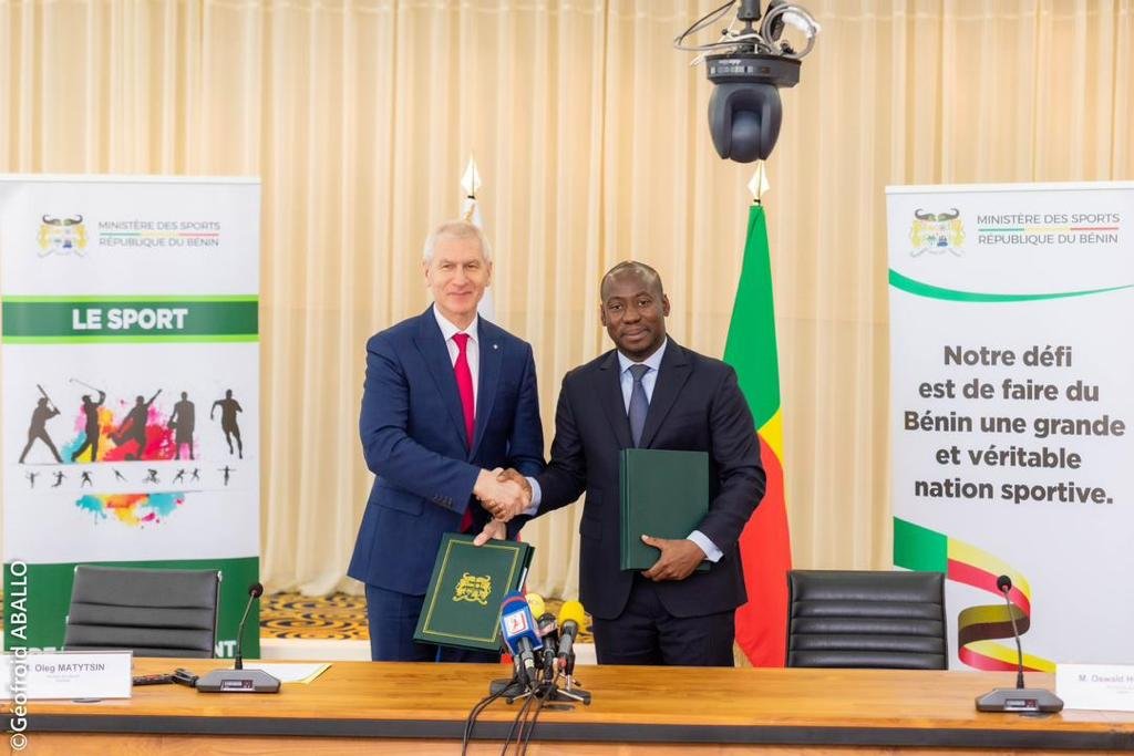 Au terme d’une séance de travail avec le Ministre des Affaires étrangères, Aurélien Agbénonci, Oswald Homeky et Oleg MATYTSIN ont procédé à la signature d’un mémorandum d’entente dans le domaine qui est le leur. Pour Oleg MATYTSIN, » c’est un pas très important que le Bénin et la Russie font. Nous allons coopérer dans le domaine du sport et de la culture physique. Le sport est une force qui nous unit tous. C’est aussi la volonté du Président Vladimir Poutine qui a signé récemment un document conceptuel dans ce sens. »