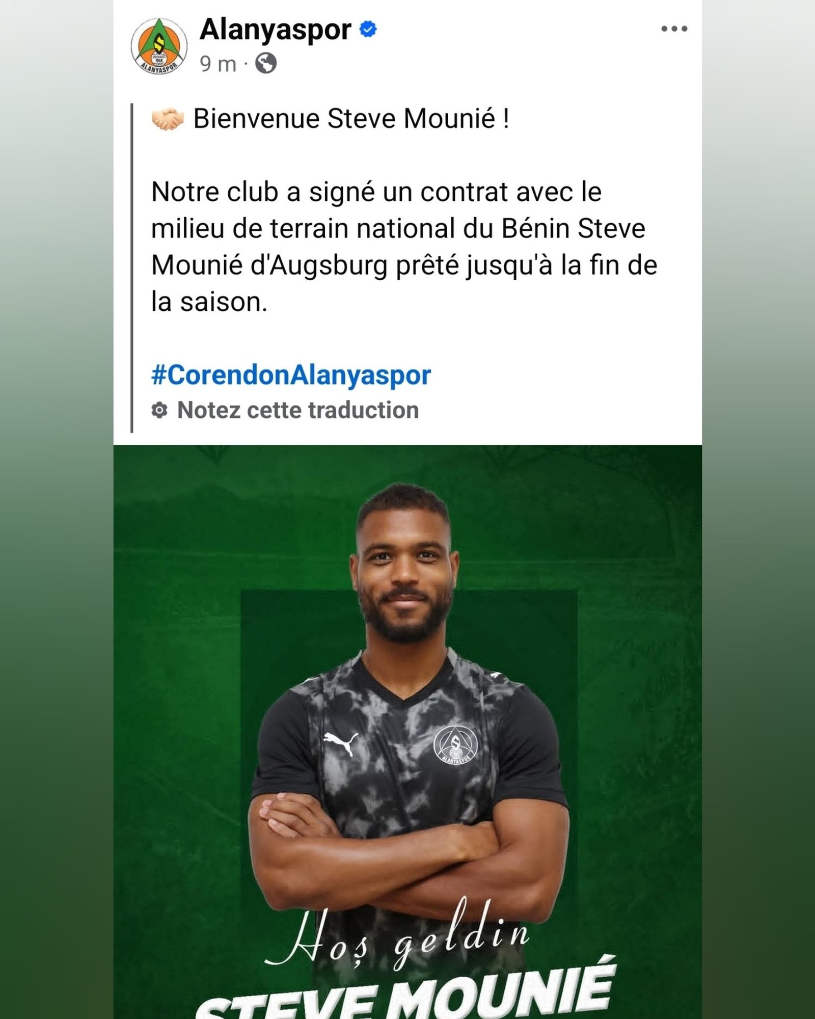 Bienvenue Steve Mounié ! Notre club a signé un contrat avec le milieu de terrain national du Bénin Steve Mounié d’Augsburg prêté jusqu’à la fin de la saison. », a publié Alanyaspor pour annoncer la nouvelle.