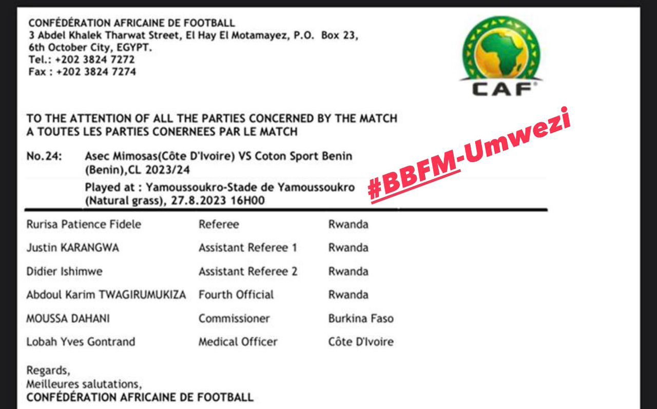 C’est un quatuor rwandais dirigé par Rurisa Patience qui sera chargé de faire respecter les règles du jeu et de maintenir l’intégrité de la partie tout au long du match qui va se tenir le 27 août 2023 à 17 heures.