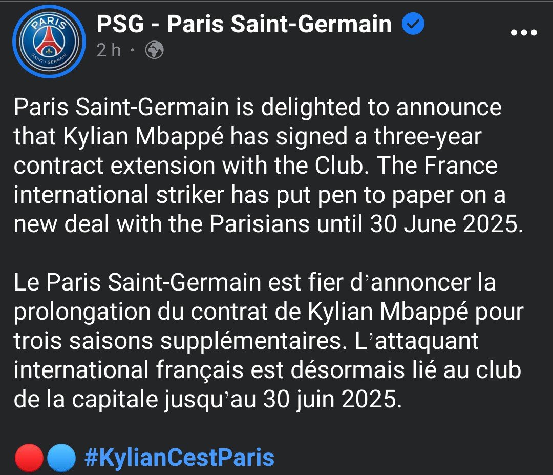 Ce samedi 21 mai 2022 soir, devant le public du Parc des Princes, avant le match face au FC Metz, Nasser Al-Khelaifi, le président du PSG, a déclaré au public : « J’ai une très belle nouvelle pour vous. Kylian Mbappé va rester jusqu’en 2025. On croit en notre projet avec lui depuis le premier jour où il est venu ici. Il va continuer avec nous, pour écrire la grande histoire du Paris Saint-Germain ».