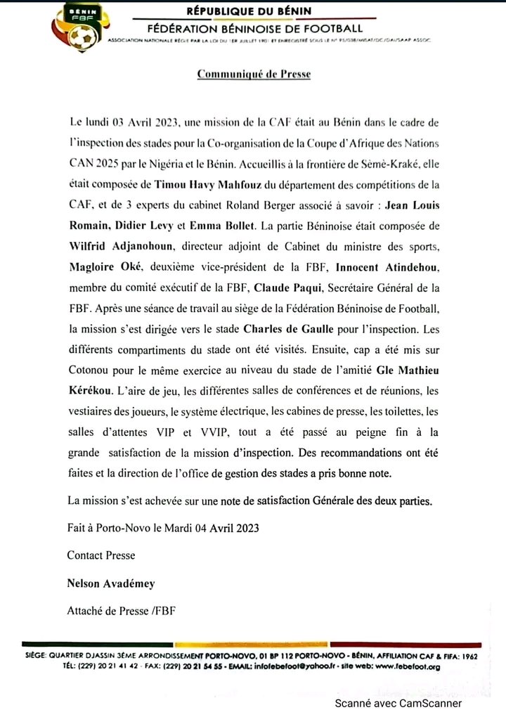 Le lundi 3 avril 2023, une délégation de la CAF est venue au Bénin pour visiter les installations du pays des Guépards, candidat à l’organisation de la CAN 2025. Dans un communiqué de presse, la fédération béninoise a donné plus de détails sur cette mission d’inspection de la CAF au Bénin le lundi 03 Avril 2023.