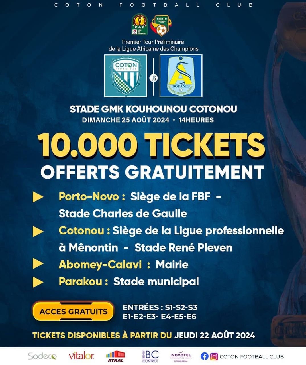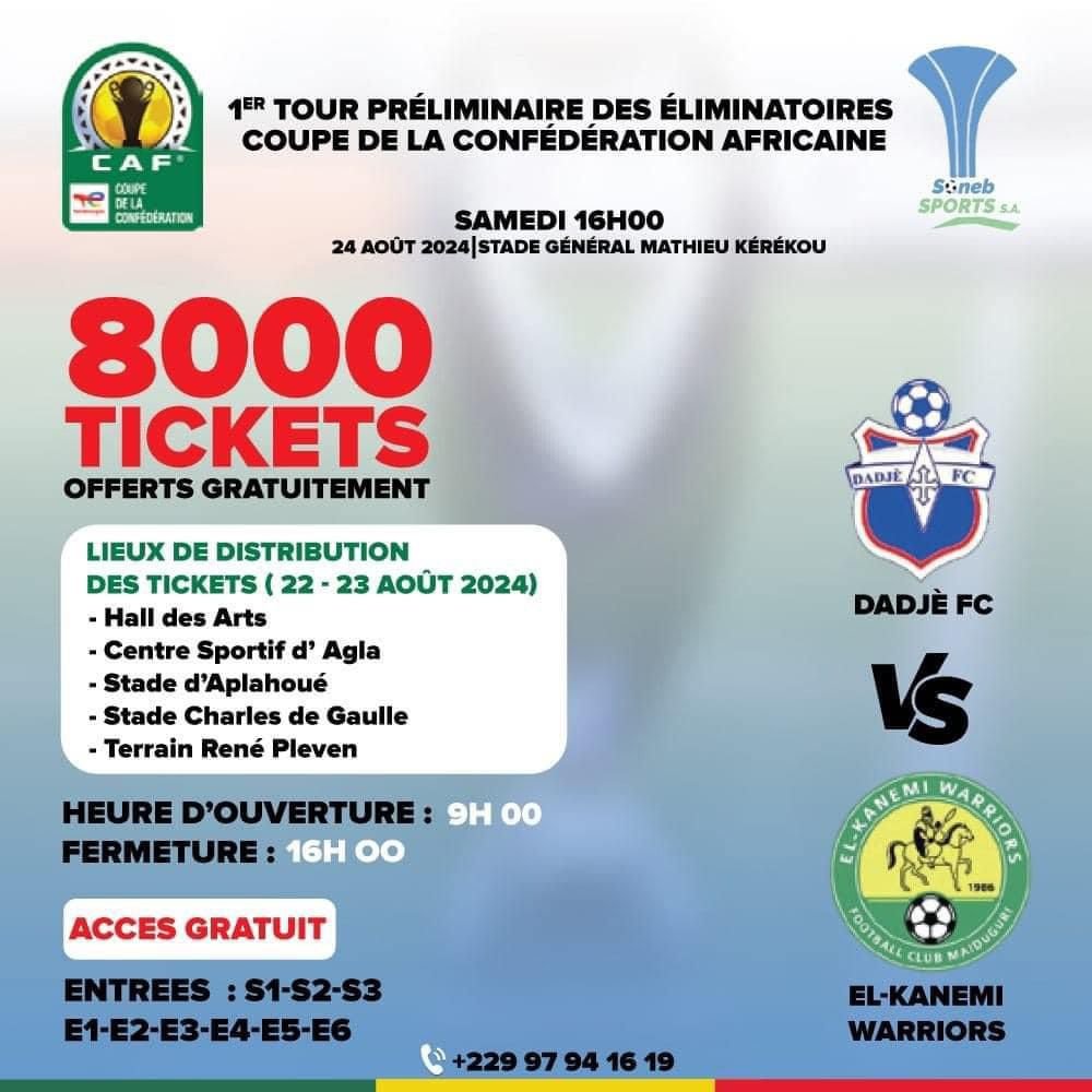 Coton FC met à disposition 10 000 billets, tandis que Dadjè FC offre 8 000 tickets pour permettre aux supporters de venir en masse soutenir leurs équipes. La distribution de ces billets gratuits commence dès le jeudi 22 août 2024, dans différents points de distribution à Cotonou et dans d’autres localités. Les tickets seront disponibles de 9 heures à 16 heures, les 22 et 23 août 2024 pour Dadjè FC.