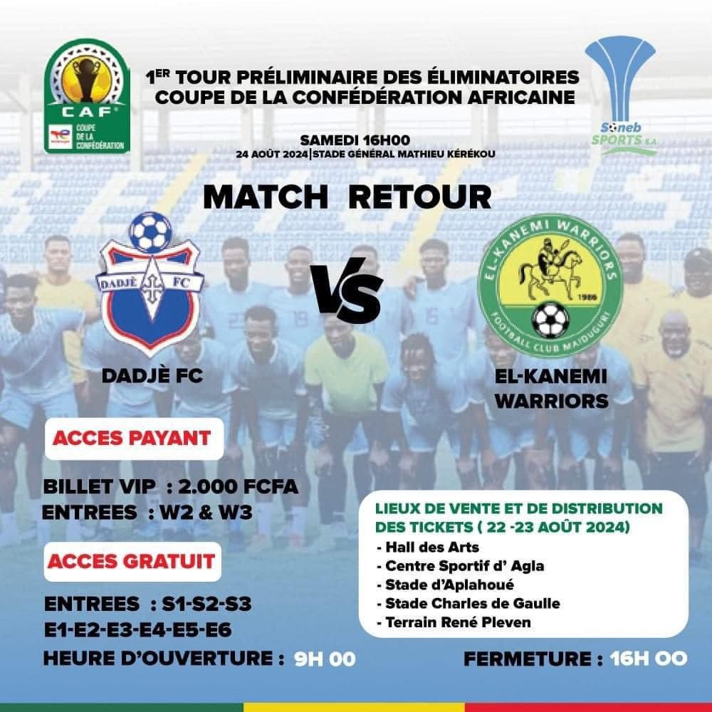 Dans le cadre des préliminaires des compétitions interclubs de la CAF, les clubs béninois Coton FC et Dadjè FC se préparent à affronter respectivement AS Douanes et El-Kanemi Warriors le dimanche 25 août 2024 au Stade Général Mathieu Kérékou (GMK) à Cotonou. Pour encourager une forte affluence de supporters, les deux clubs ont décidé d’offrir gratuitement des billets d’entrée au stade.