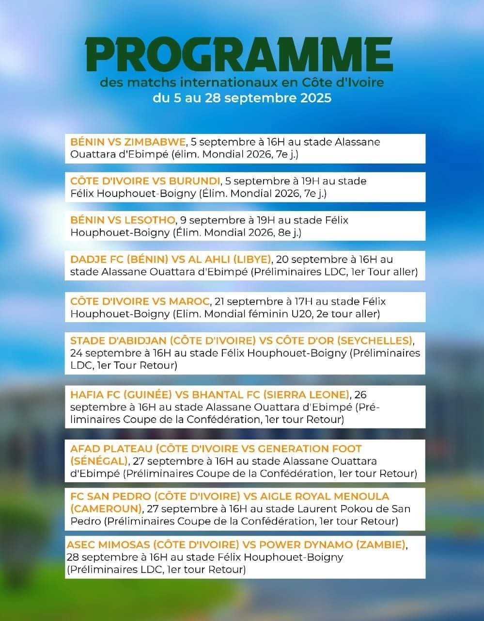 Programme des matchs en Côte d’Ivoire (Septembre 2025)