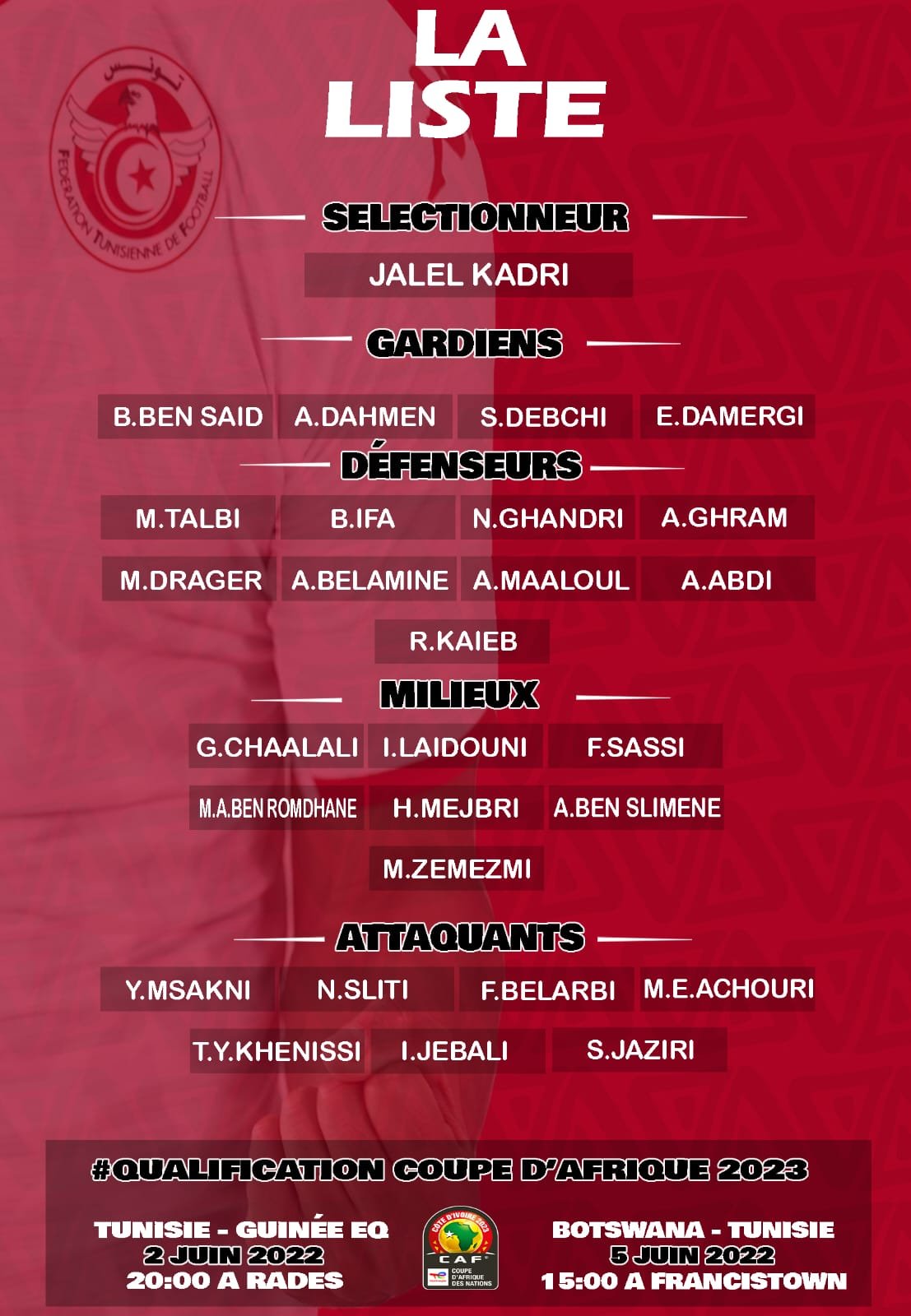 Pour affronter la Guinée et le Botswana respectivement les 2 et 5 juin 2022, dans le cadre des éliminatoires pour la Can 2023, la Tunisie sera privé de son numéro 10, Kazri. L’attaquant de Saint-Étienne , n’a pas été retenu dans la liste des 27 joueurs dévoilée par le selectionneur de la Tunisie ce jeudi 26 mai 2022. Plusieurs habitués de la sélection sont présents dans cette liste .