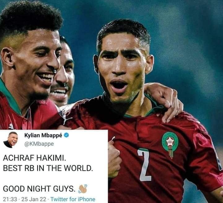 Kylian Mbappé : « Achraf Hakimi. Meilleur latéral droit du monde. Bonne soirée les gars. »