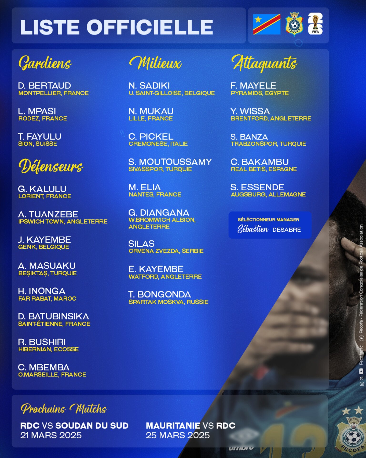 La République Démocratique du Congo (RDC) a dévoilé sa liste des 23 joueurs retenus pour la reprise des éliminatoires de la Coupe du Monde 2026. Parmi les grandes nouveautés, on note le retour de Cédric Bakambu, absent depuis la CAN 2023, ainsi que ceux de Yoane Wissa, Axel Tuanzebe et Grady Diangana.