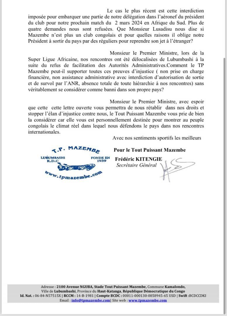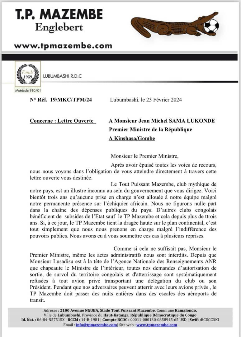 À travers un courrier adressé ce vendredi 23 février 2024 au Premier ministre de la RDC, Jean Mikaël SAMA LUKUNDE, la direction du TP Mazembe a indiqué survivre aux dépens de ses moyens pour les compétitions africaines.  » Bientôt 3 ans qu’aucune prise en charge n’est allouée à notre équipe malgré notre permanente présence sur l’échiquier africain. Nous ne figurons nulle part dans la chaîne des dépenses publiques du pays.« , a déploré le club. Le communiqué précise également les restrictions imposées par certains départements ministériels au Tout-Puissant Mazembe.