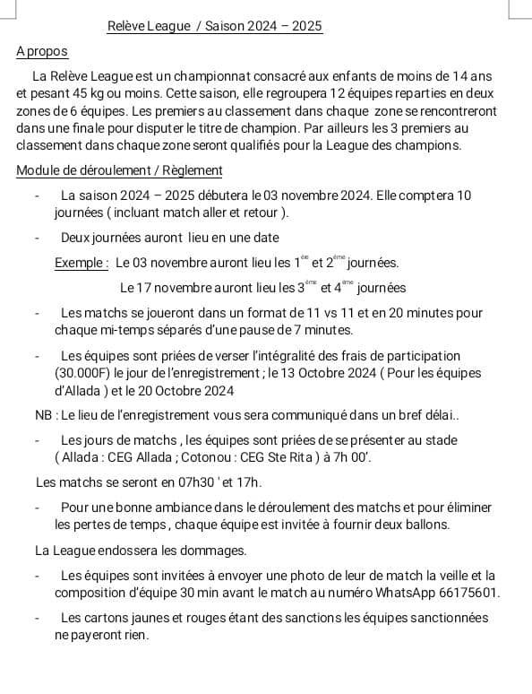 Au Bénin, la saison 2024-2025 de l’initiative Relève League s’annonce déjà en grande pompe. Elle débutera le 3 novembre 2024. Ce championnat est destiné aux jeunes de moins de 14 ans, pesant 45 kg ou moins. Il regroupera 12 équipes, réparties en deux zones de six. La première zone est Allada et la deuxième Cotonou. Les matchs se joueront dans un format de 11 contre 11, avec deux périodes de 20 minutes. Les meilleures équipes de chaque zone se qualifieront pour la Ligue des champions.
