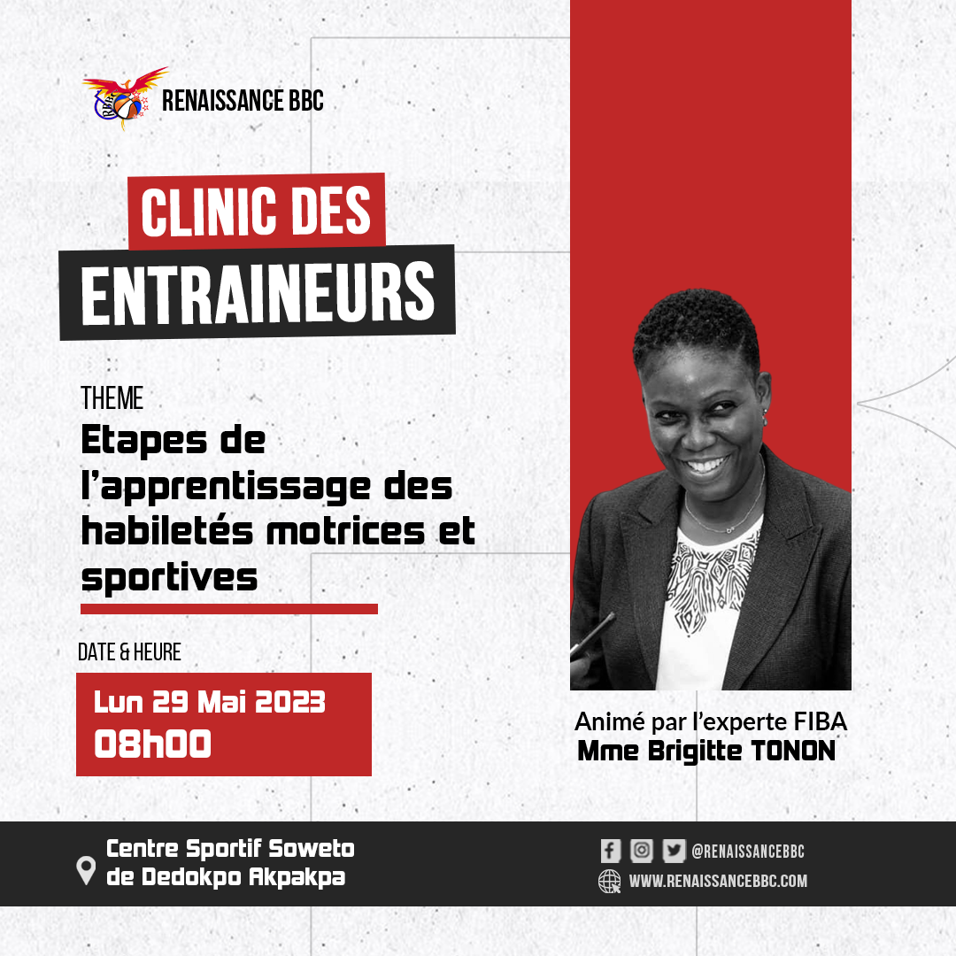 Renaissance Basketball Club organise un clinic spécial destiné aux entraîneurs de basketball ce lundi 29 mai 2023. L’événement se tiendra au Centre sportif Soweto de Dedokpo Akpakpa et sera animé par l’experte renommée de la FIBA, Mme Brigitte Tonon. Les participants ont eu l’occasion d’approfondir leurs connaissances sur les étapes de l’apprentissage et de compléter leurs compétences en matière de coaching. Cette initiative fait partie des programmes d’activités de Renaissance Basketball Club visant à offrir une formation de qualité aux techniciens du basketball.