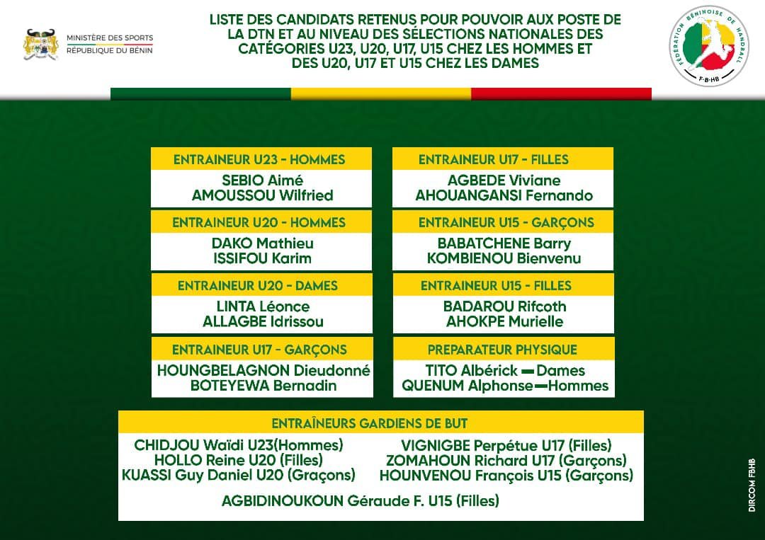 En effet, dans son ambition de structuration et de la dynamisation de la Direction technique nationale (DTN) près de la Fédération Béninoise de Handball, le ministère des Sports de la République du Bénin a initié des réformes. Dans ce cadre, et conformément aux directives du ministère, la Fédération béninoise de handball a lancé un appel à candidature aux fins de recruter des cadres techniques compétents pour pouvoir aux postes au niveau de la DTN et au niveau des sélections nationales des catégories U23, U20, U17, U15 chez les hommes et des U20, U17 et U15 chez les dames. Nombreux sont les cadres techniques de la famille du handball qui ont déposé leur dossier aux fins de contribuer à leur manière, au développement de ce sport au Bénin. Après étude des dossiers et dépouillement par le Ministère des Sports et la FBHB, les noms des candidats retenus se présentent comme suit :