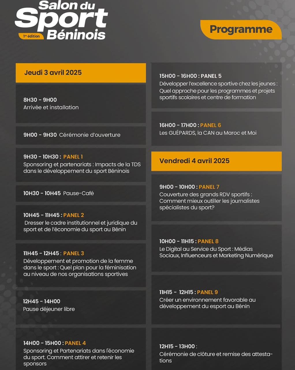 Pendant ces deux jours, le salon s’articulera autour de neuf panels, avec des discussions sur des thèmes essentiels tels que le sponsoring, la formation des jeunes talents, l’essor du e-sport, le rôle des médias et du digital dans le sport, ainsi que l’expérience des Guépards du Bénin à la CAN 2025.