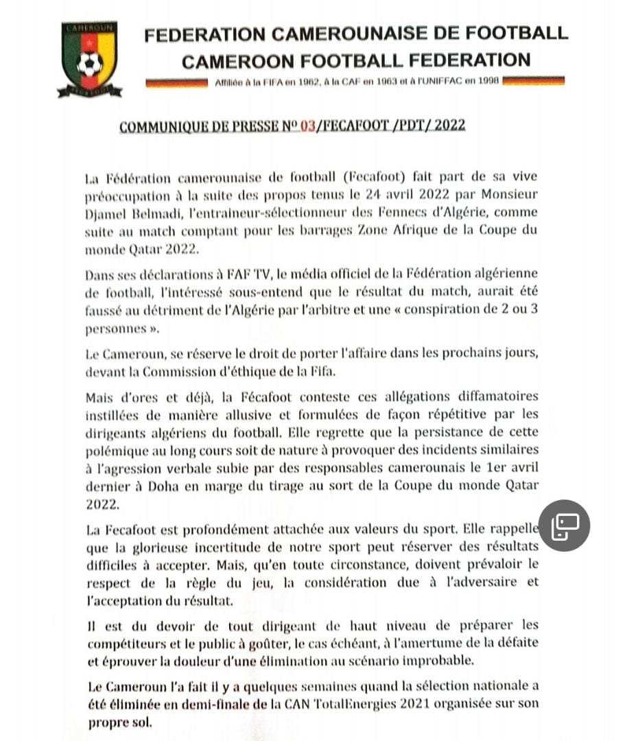 Lorsque le tirage au sort des barrages de la coupe du monde 2022 a accouché d’une affiche Cameroun vs Algerie, on savait que rien ne sera facile lors de cette double confrontation. Mais rien ne montrait que les choses allaient prendre la tournure qu’elles prennent, même plusieurs jours après le match. Malgré une défaite par 1 but à zéro au match aller à domicile, le Cameroun est parvenu à se qualifier pour la coupe du monde 2022, après une victoire 2-1 sur l’Algérie lors du match retour à Blida. Une défaite et une élimination que les algériens n’acceptent pas, eux qui pointent du doigts l’arbitrage du match retour. Samuel Eto’o, est monté au créneau, pour mettre les choses au claires avec les algériens, en réponse à une n ième sortie du selectionneur de l’Algérie, Djamel Belmadi sur le sujet.