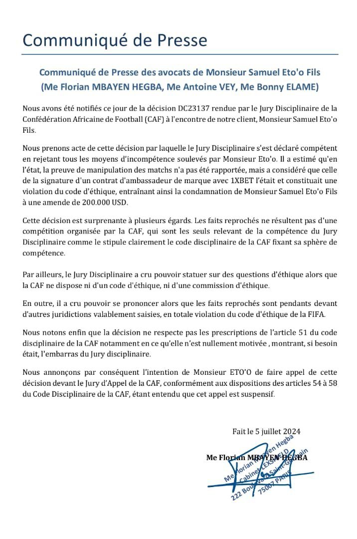“Nous notons enfin que la décision ne respecte pas les prescriptions de l’article 51 du code disciplinaire de la CAF notamment en ce qu’elle n’est nullement motivée, montrant, si besoin était, l’embarras du Jury disciplinaire. Nous annonçons par conséquent l’intention de Monsieur Eto’o de faire appel de cette décision devant le Jury d’Appel de la CAF, conformément aux dispositions des articles 54 et 58 du code disciplinaire de la CAF étant entendu que cet appel est suspensif”, conclut la note.