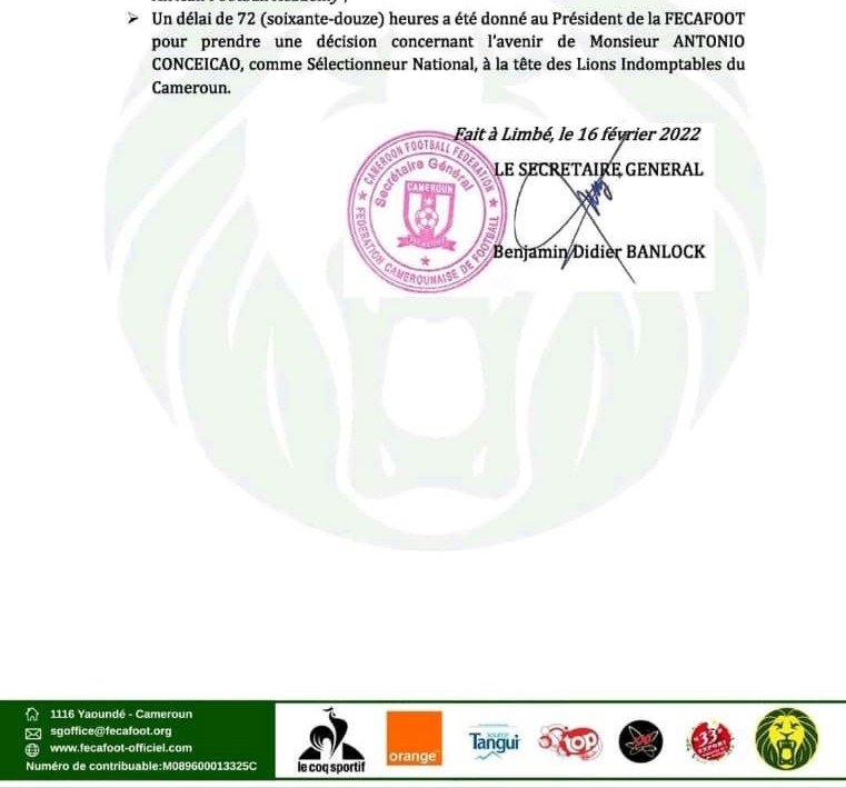 La décision ne fait pas apparemment l’unanimité au niveau des dirigeants puisque lors de la session ordinaire, au cours duquel plusieurs résolutions ont été adoptées, il a été donné à Samuel Eto’o, président de la Fecafoot, un délai de 72h pour fixer définitivement le sort du selectionneur Antonio Conceiçao.