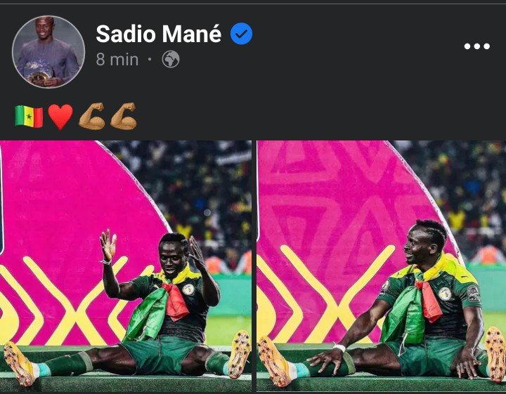 Convoqué pour le mondial 2022, Sadio Mané a publié sur les réseaux sociaux, deux photos sur lesquelles il se trouve dans le maillot du Sénégal, assis, le drapeau sénégalais sur lui. Il a mis comme légende des stickers du drapeau sénégalais et du cœur, symbole de l’amour, comme le montre l’image ci-dessous :