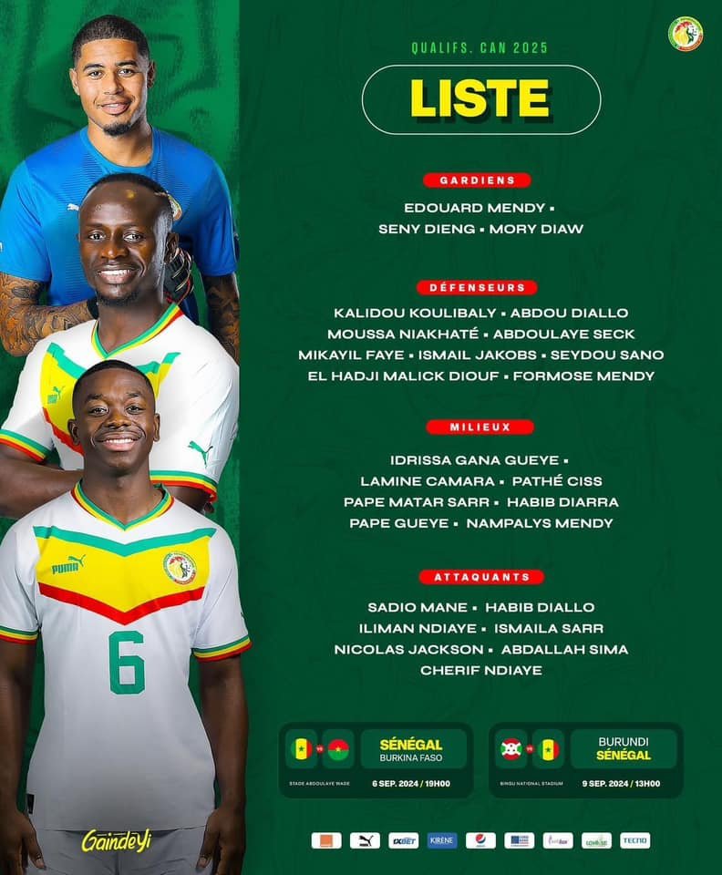 Le Sénégal affrontera le Burkina Faso le 6 septembre 2024 à Dakar, avant de se déplacer au Malawi pour affronter le Burundi le 9 septembre 2024. Ce qui retient l’attention dans cette liste est la présence d’un nouveau, El Hadji Malick Diouf. Le jeune joueur a reçu s première convocation. En conférence de presse, Aliou Cissé a commenté le choix d’El Hadji Malick Diouf : « C’est l’avenir de l’Equipe Nationale ».