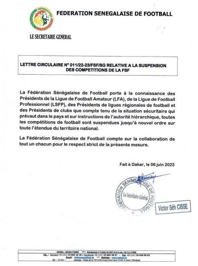 Le football sera en pause pendant un moment au Sénégal. Dans une lettre circulaire, la fédération sénégalaise de football a annoncé, ce mardi 6 juin 2023, sa décision de suspendre toutes les compétitions de football, compte tenu de la situation sécuritaire qui inquiète. Cette suspension est pour une durée indéterminée.